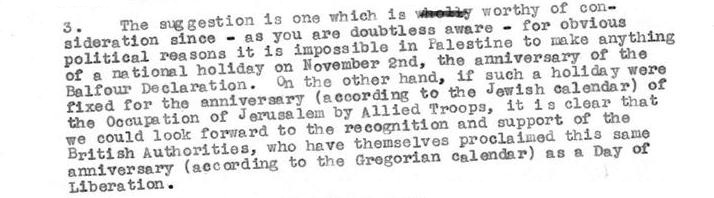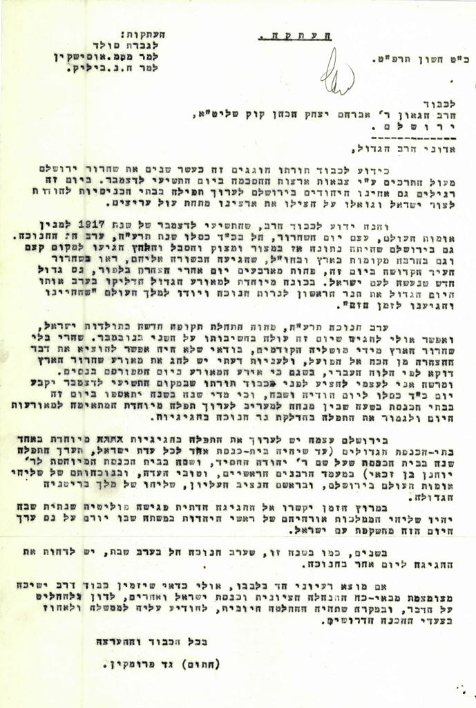 גד פרומקין, משפטן יהודי ושופט בבית המשפט העליון בתקופת המנדט, חשב שיש לציין באופן רשמי את יום כיבוש ירושלים על ידי הבריטים דווקא בתאריך העברי – ערב חנוכה. הוא פנה לרב קוק במכתב בנובמבר 1928, שבו הציג את הצעתו. הוא שילב במכתבו תיאור מפורט של הטקסים והחגיגות – בדומה לחגים יהודיים אחרים – שיש לערוך לפי דעתו ביום זה. במכתבו כתב, שלמרות המנהג לציין גם את יום הצהרת בלפור, מבלי להמעיט בחשיבותו, יום כיבוש ירושלים עולה עליו, מכיוון שבזכות הכיבוש הבריטי אפשר היה להוציא לפועל את הכרזת בלפור.