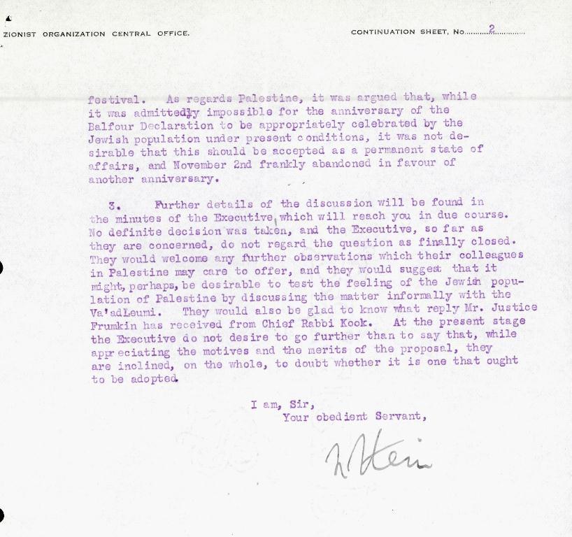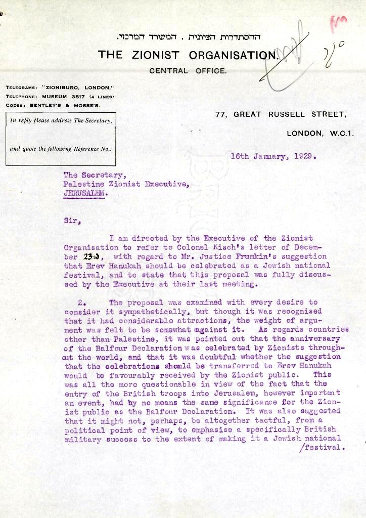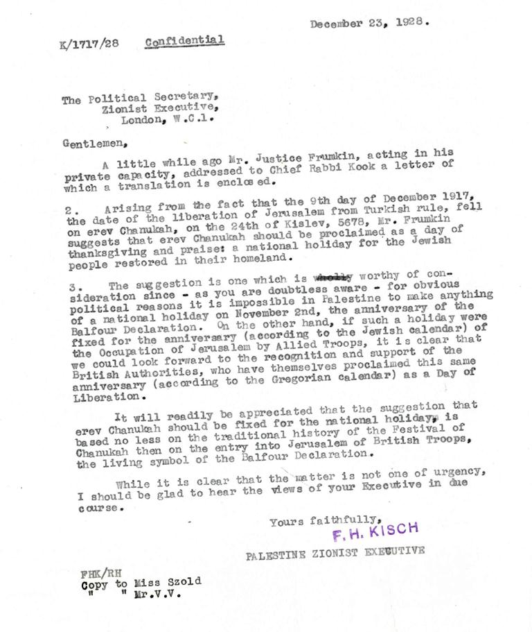 במקביל למכתבו של פרומקין גם פרדריק הרמן קיש, ראש המחלקה המדינית של הסוכנות, פעל לטובת העניין. ב- 23 בדצמבר שלח קיש מכתב להנהלה הציונית בלונדון עם הצעתו של פרומקין על מנת לקבל את חוות דעתה על ההצעה. המכתב של קיש מבהיר את הצעתו של פרומקין – ניסיון לקבוע חג לאומי חדש ליהודים בארץ ישראל. קיש כתב להנהלה הציונית, כי בהתחשב בעובדה שהבריטים לא התירו ליהודים בארץ ישראל לחגוג את יום הצהרת בלפור בשל שיקולים פוליטיים, כדאי לשקול את ההצעה. להערכתו, השלטון הבריטי עשוי להתיר לחגוג את תאריך כיבוש ירושלים מאחר שהוא לא לאומי מדי.