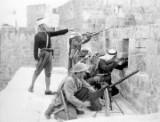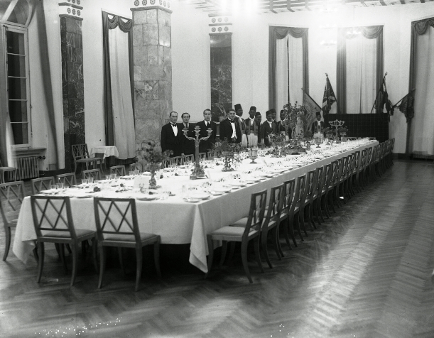 שולחן ערוך עם דגלי היחידה של ה- Seaford Highlanders (גדודים סקוטים) במלון המלך דוד לקראת פגישה של הגדודים,