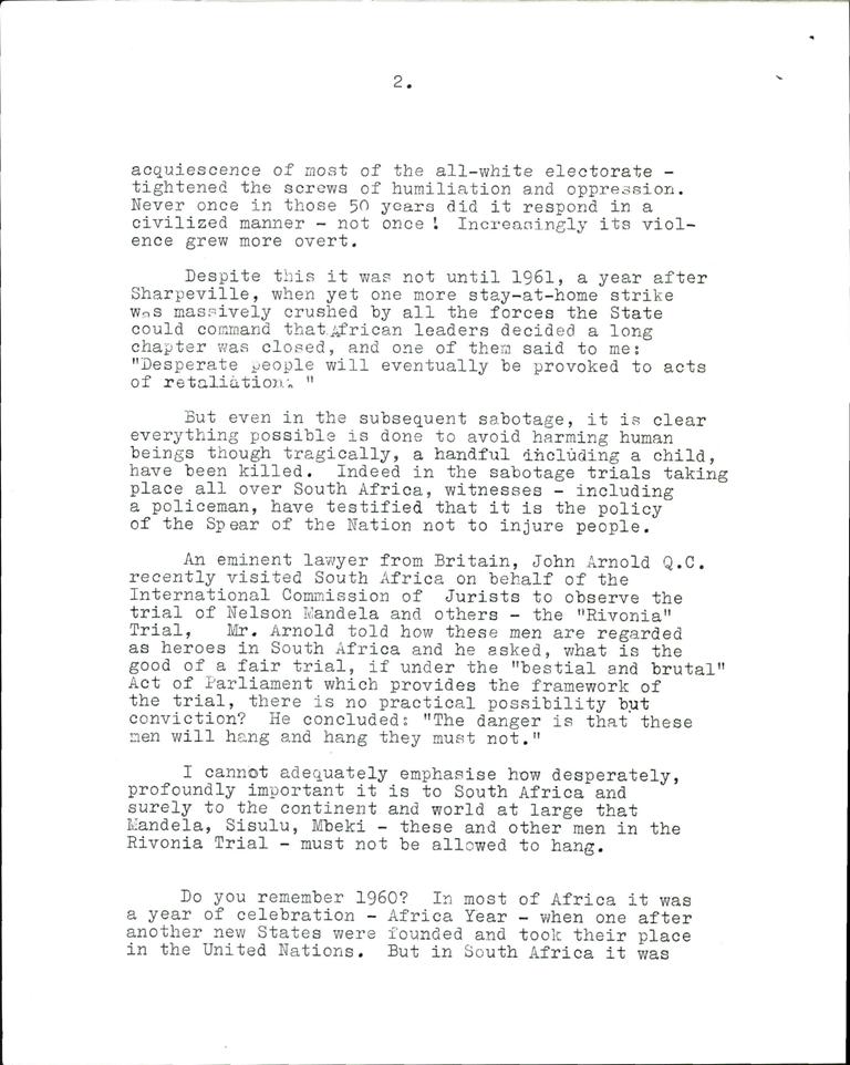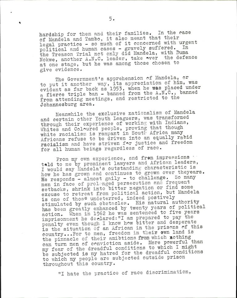 בשבוע שעבר נפטר נלסון מנדלה, האיש שהפך לסמל במאבקו נגד שלטון האפרטהייד בדרום אפריקה. המצב הפוליטי והחברתי בדרום אפריקה השפיע על הקהילה היהודית שחיה שם, וניתן ללמוד על כך מתיקי ההתכתבות הרבים, הנוגעים לפעילות הציונית והכלל-יהודית בארץ זו. לדוגמה, בתיק מארכיון המשרד בלונדון של הקונגרס היהודי העולמי משנת 1964 מופיעה עדותה של מרי בנסון (Mary Benson) לפני ועדה של האו"ם שעסקה במדיניות האפרטהייד בדרום אפריקה. בעדותה היא מתארת את סיפורם של האנשים, שהועמדו לדין ב"משפט ריבוניה". משפט זה נערך לראשי "הקונגרס הלאומי-אפריקאי", ביניהם נלסון מנדלה, שנעצרו והואשמו בפעילות טרור כנגד המשטר. נלסון מנדלה כבר שהה בכלא בזמן שהחל "משפט ריבוניה" בשל אישומים אחרים.