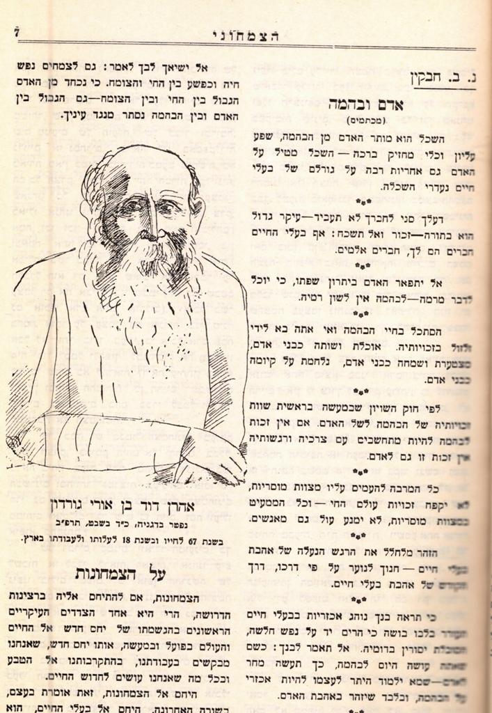 חבקין  במהלך עבודות במשק בגבעת שאול. צילום מתוך "הצמחוני". בארץ ישראל הפך חבקין לפעיל נלהב למען קידום עבודת השדה, שאותה תפס כנגזרת מתפיסת עולמו. הוא התיישב בגבעת שאול, אז נקודת יישוב עזובה ומרוחקת, והקים בה לבדו משק חקלאי לתפארת תוך מלחמת חורמה  בקרקע הסלעית. במו ידיו חצב באר ומערה אשר שימשה אותו כמחסן. את האדמות הסמוכות למשק שייסד הוא ייעד לרעיונו השאפתני ביותר: הקמת מושבה צמחונית ראשונה בארץ ישראל.