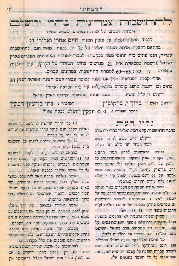 בשנות ה- 30 נפטר נדבן יהודי גדול – חיים אהרון ואלירו, שתרם רבות לפיתוחה של ירושלים. בעזבונו הייתה גם חלקת אדמה בת 120 דונם בקרבת גבעת שאול. ב- 1933, ברוח הפילנתרופיות שאפיינה את בעל הקרקע המנוח, הוצעה האדמה חינם אין כסף לכל חברה עברית, שיעלה בידה להוציא אל הפועל התיישבות עברית כשרה במקום. "אגודת הצמחונים" של חבקין נענתה ברצון לאתגר. שמו של היישוב המתוכנן היה "גבעת שאול החדשה", ותכניות של היישוב והסבר לגבי משנתו האידיאולוגית הופיעו בביטאון האגודה. ביישוב, כך נכתב, יחיו התושבים בהרמוניה עם הטבע ועם יושביו, ההולכים על שתיים ועל ארבע כאחד.