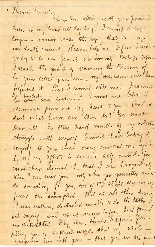 "ישבתי עם מכתבך היקר בידי במשך כל היום. אני לא יכולה לחכות עוד - אני חייבת לענות תשובה שתחרוץ את דיני למות... אתה חייב לדעת הכל. בחדשים קשים אלו, של מאבקי הבודד בעצמי, בטח גרמתי לך לחשוד, בשל ראייתך החדה, במאמצי להפעיל שליטה עצמית. בטח הכחשת זאת – הייתי שלווה רק לידך... מדוע אם כן שאמנע מ"להרוג אותך" במילים מפורשות. כל אושרי תלוי בך. אתה הראשון שמעניק לנפשי את הנשיות שלה. נפש שעד שהתעוררה על ידך, ידעה רק אהבת בת לאביה. אתה מנחש את השאר, ואת כל שאסכים לסבול על מנת להחזיק בך לעד."