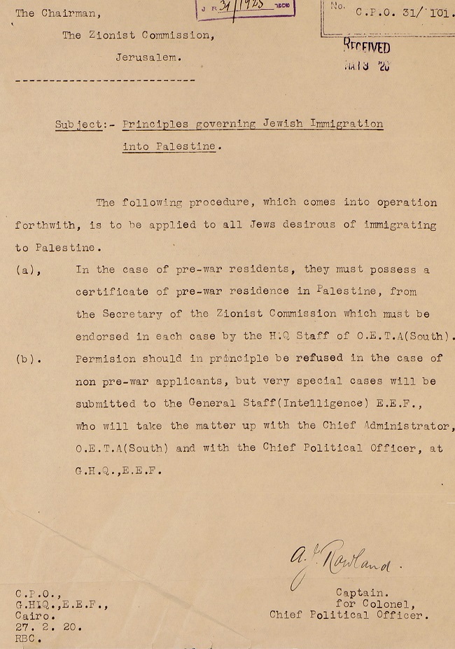 מכתב מקפטן רולנד על וועד הצירים. "בעיקרון, תסורב פנייתם של אלו שאינם תושבים חוזרים (לאשרת הגירה)". (L31\3)