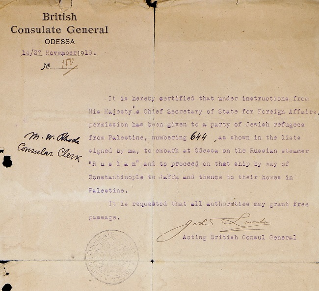 יוצאים לדרך. אישור של הקונסול הבריטי המאפשר ל"רוסלאן" להתחיל את מסעה מאודסה לארץ ישראל (L4\1000)
