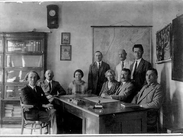 ד"ר ברוך ניסנבוים מייסדו של מגן דוד אדום,(יושב, שני מימין), בלוויית הנרייטה סאלד וחברי הנהלת מגן דוד אדום. אוקטובר, 1925 ( PHG\1023788)