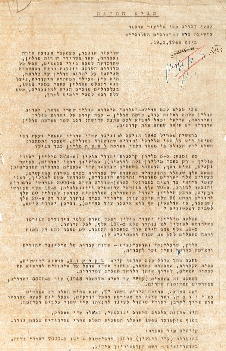 המסמך, יומיים לאחר הגעתו לארץ, ב-19.1.1944, התייצב אונגר ונשא דברים קשים
