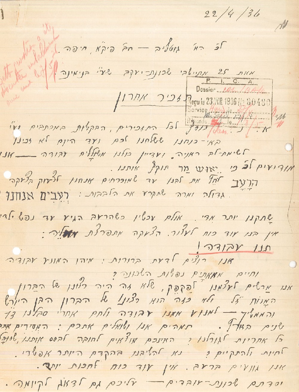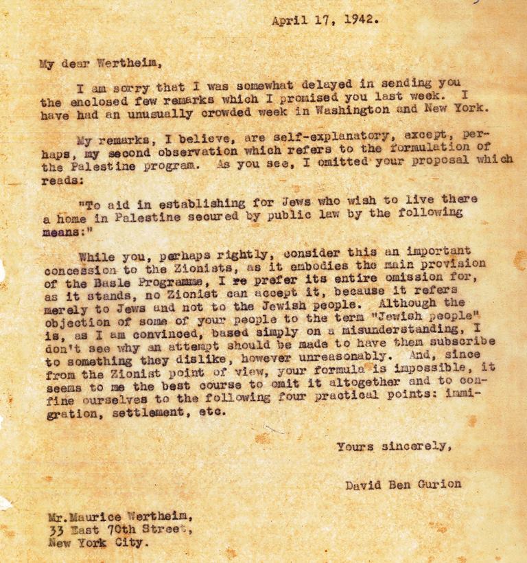תשובתו של בן- גוריון למוריס וורטהיים לגבי חשיבות השימוש במונח "העם היהודי" עבור הציונים. יחס עם זאת, בן- גוריון מגלה הבנה לחוסר הנוחות שהמושג גורם לוורטהיים וחברי חוגו. אפריל 1942 (S25\41)