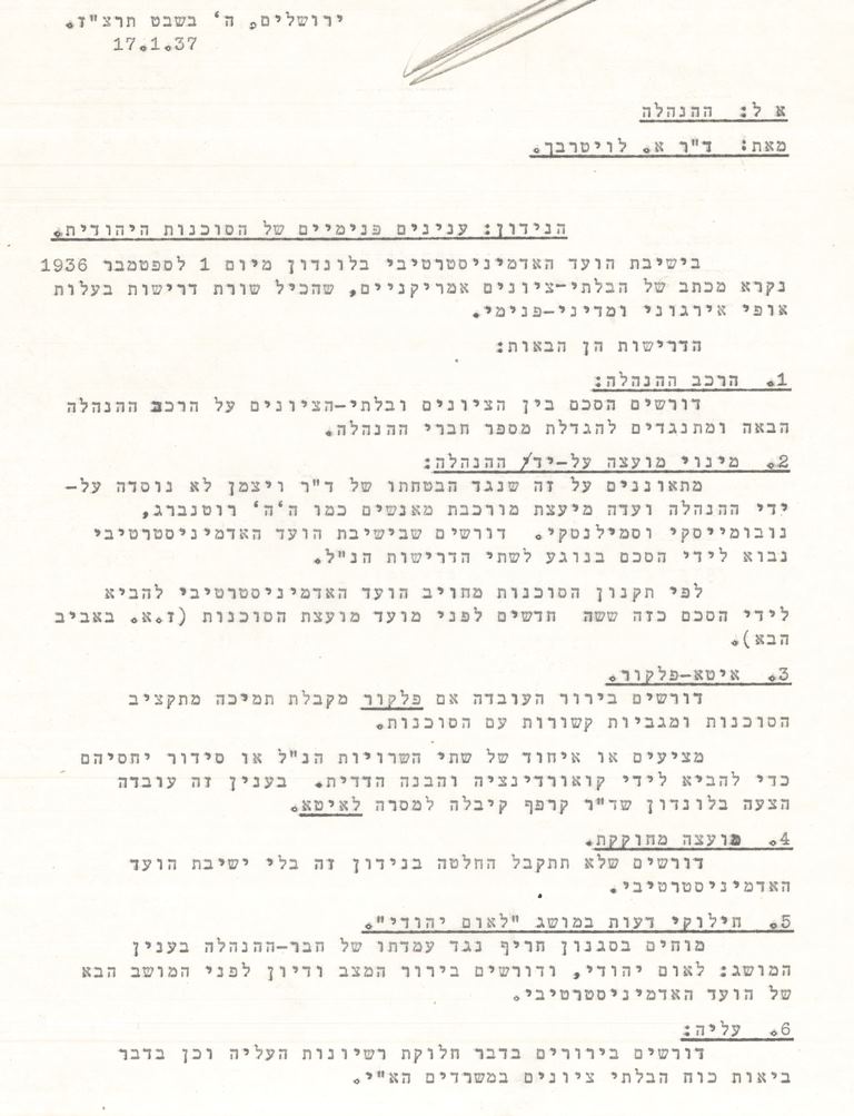 מכתב של בלתי-ציונים אמריקאים להנהלת הסוכנות, ינואר 1937. סעיף 5 נוגע ל"חילוקי דעות בנוגע למושג "לאום יהודי". סעיף 6 מבקש "בירורים בדבר חלוקת רשיונות עלייה". (S29\25)