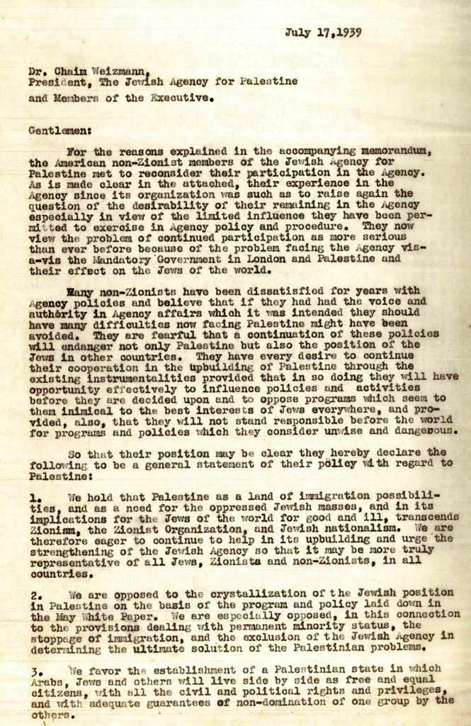 מתוך רצון לנסות ליישר את ההדורים שלחו נציגי הבלתי-ציונים האמריקאים בסוכנות היהודית נייר עמדה ביולי 1939. במכתבם הגדירו את ארץ ישראל כמקום מקלט למהגרים יהודים אך לא כבית לאומי, וקראו להקמת מדינה דו-לאומית. כמו כן, ציינו כי הם מתנגדים ל"פעילות טרוריסטית על ידי יהודים" בתגובה או כאמצעי להפעלת לחץ על שלטונות המנדט. בנוסף, מתחו ביקורת על האפליה לרעה של ערביי הארץ על ידי קק"ל ועל ידי ההסתדרות. בארץ ישראל לא צריך להיעשות דבר, הם טענו, שעלול לסכן את מעמד יהודי העולם בארצותיהם.