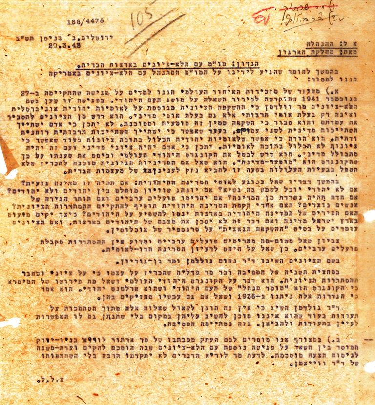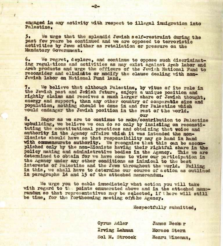 נייר העמדה של הבלתי ציונים האמריקאים להנהלת הסוכנות היהודית, 1939. (S25\1441)