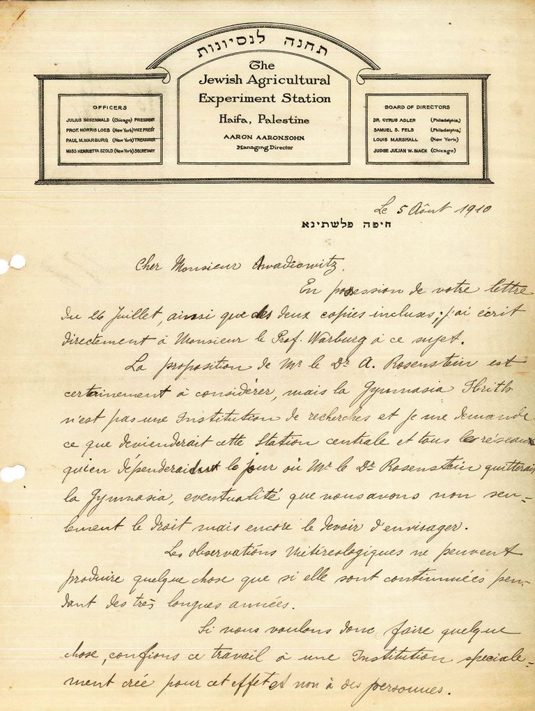 מכתב בכתב ידו של אהרנסון, בו הוא דן בניסיונות לכונן מערך תחנות מטאורולוגיות. מתנדבים חסרי הכשרה מתאימה מאיישים את התחנות, הוא כותב, והתיעוד איננו בעל תוקף מדעי. 1910 (L1\66)