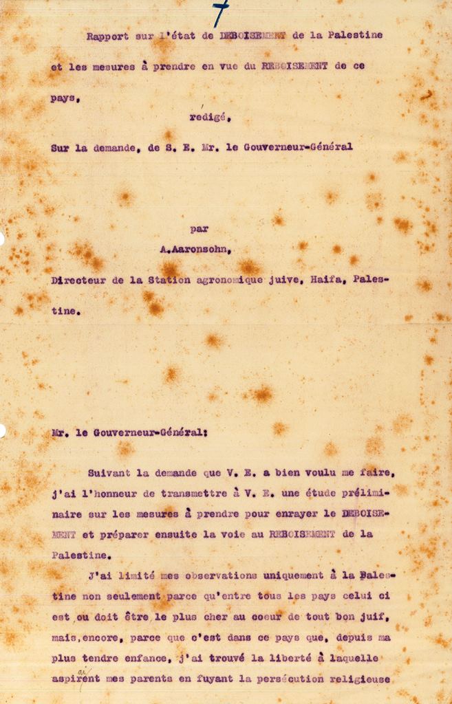 דו"ח שהוגש על ידי אהרנסון לשלטונות העות'מאנים ב- 1913 בנוגע לעתיד הייער בא"י. אהרונסון ממליץ להגביל שימוש בעצים לייצור פחם וסיד ומתריע משימוש בלעדי בעצי מחט לייעור, בשל סכנת שריפות. (J15\2280\1)