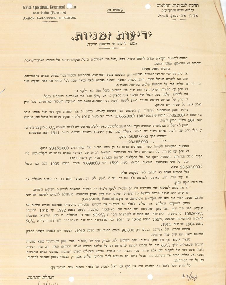 דו"ח של התחנה לנסיונות חקלאיים, 1914. המלצה לנטוע עצי מנדרינות ואשכוליות לייצוא לאנגליה. (L2\148)