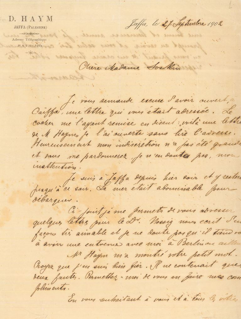 "גברת סוסקין היקרה". מכתב מאהרנסון לסוניה סוסקין, מיפו, 1902. האישה היחידה שאי פעם אהב הייתה אישתו של אחר (A91\40)