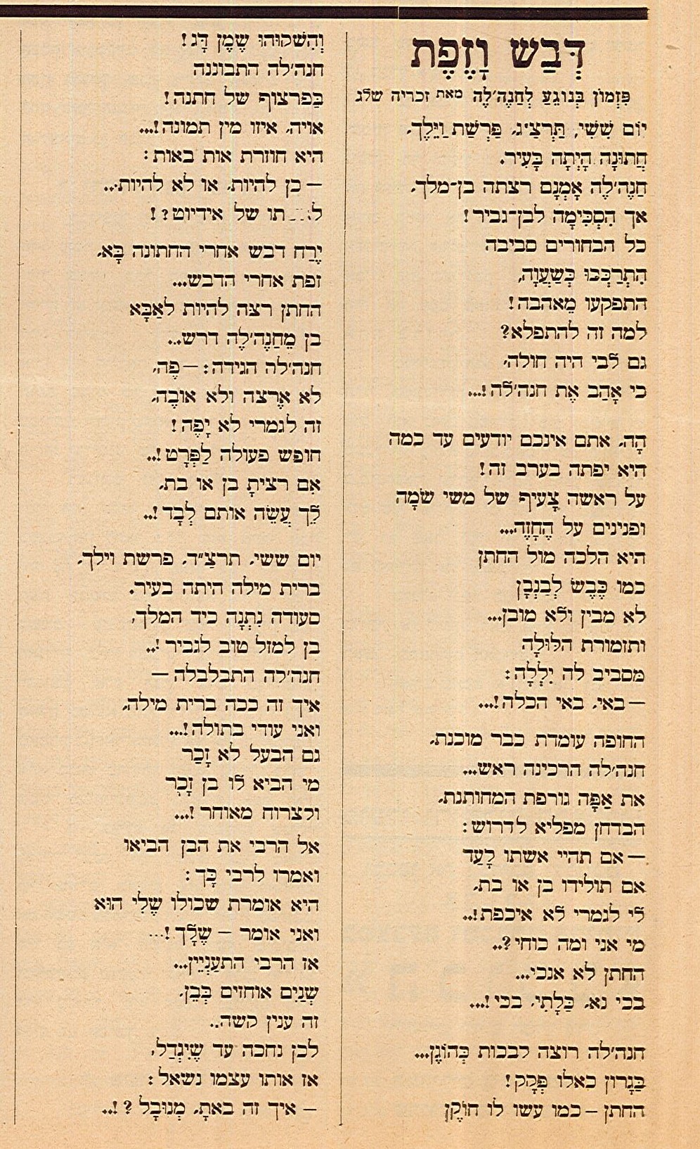 הומוריסטי של עיתון קבוע לפני חגים או אירועים מרכזיים. בחוברת ההומוריסטית "אץ קוצץ" לחנוכה תרצ"ד (1933) הופיע שיר הומוריסטי בשם "דבש וזפת", הדומה מאוד לשיר הידוע "חנהל'ה התבלבלה".