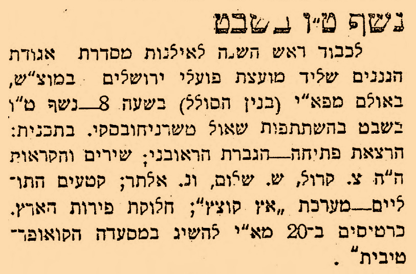 היתוליים בנשף ט"ו בשבט – ביניהם נ. אלתר (ככל הנראה אלתרמן), דיווח בעיתון