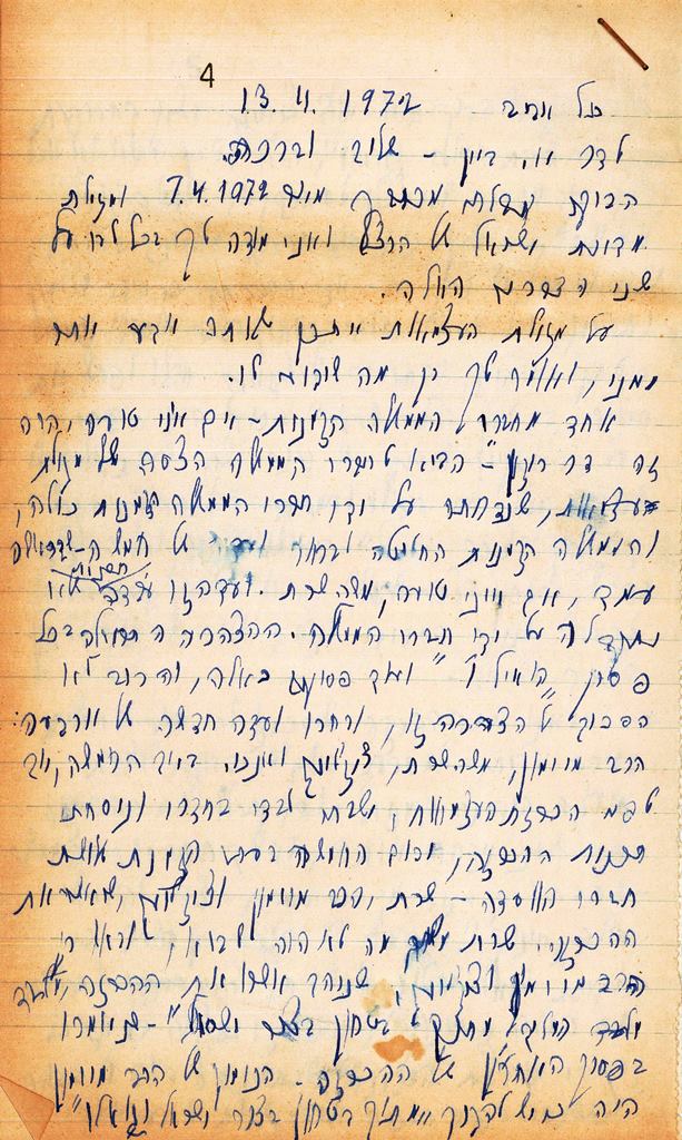 דף ראשון מתוך מכתבו של דוד בן גוריון לאלכס ביין, 13\11\1972. (בכתב ידו של בן גוריון)