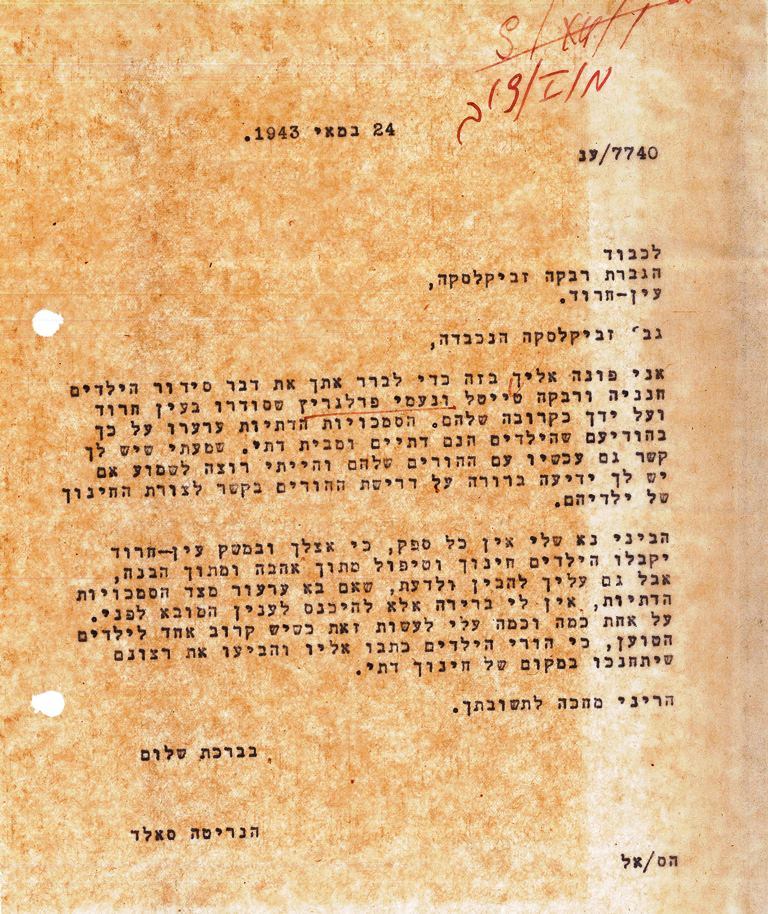 מכתב מהנרייטה סאלד לאחת מקרובות ילדים שהגיעו ארצה כחלק מ"ילדי טהרן", בו היא מנסה לברר מה הוא החינוך בו
