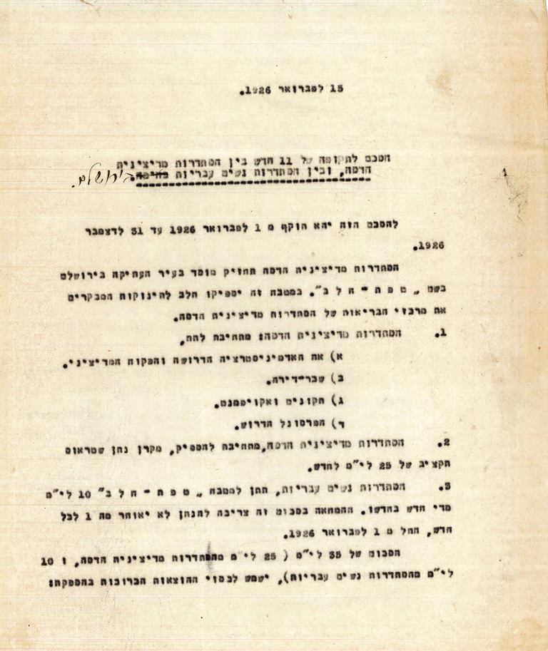 הסכם בין הסתדרות מדיצינית הדסה להסתדרות נשים עבריות להקמת טיפת חלב, פברואר 1926 (J113\1347)