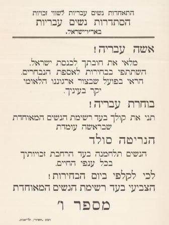 כרוז בחירות: התאחדות נשים עבריות לשווי זכויות והסתדרות נשים עבריות בארץ ישראל, רשימה בראשות הנרייטה סאלד (J75\14)