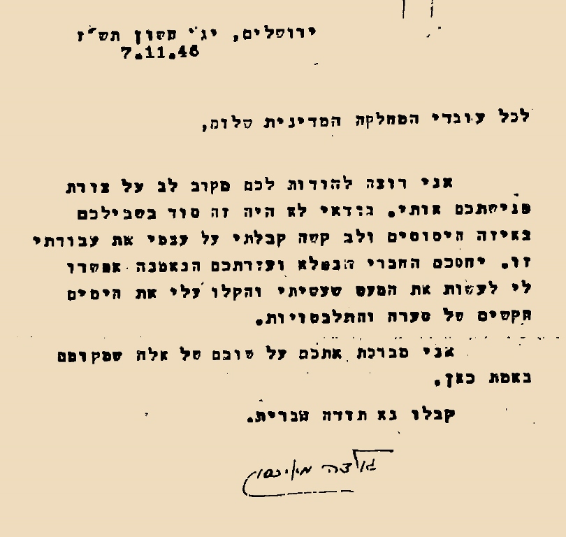 ברכה של גולדה לעובדי המחלקה המדינית של הסוכנות עם כניסתה לתפקיד, 7.11.1946 (S25\1523)