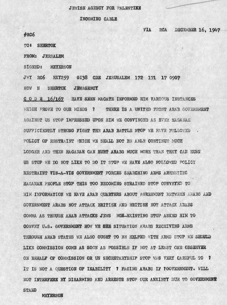 מברק מגולדה מאירסון למשה שרת, 16.12.1947 (Z5\3535)