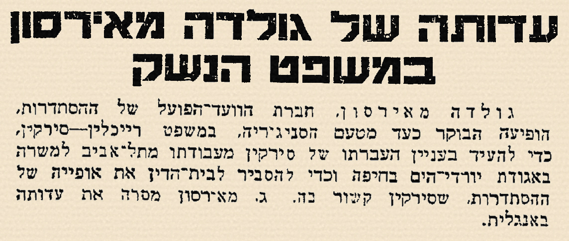 היא כבר נדרשה בעבר לתת לבריטים דין וחשבון על פעילות ה"הגנה", כששימשה כמזכירת הוועד הפועל של ההסתדרות, והייתה עדה מרכזית במשפט רייכלין-סירקין, בספטמבר 1943. המשפט, שבו הואשמו שני חברי הסתדרות העובדים בהעברת נשק מהצבא הבריטי לישראל, שימש לצרכי ראווה ונוצל להכפשת מוסדות ההנהגה, ובעיקר הסוכנות היהודית ומפעל ההתנדבות היהודית לצבא הבריטי. בתגובה למשפט הכריזה הנהלת הוועד הלאומי על שביתה כללית ביישוב. גולדה מאירסון נקראה אז לדוכן העדים על מנת להעיד על חפות הארגון וחבריו מגנֵבה ומשימוש בלתי חוקי בנשק.