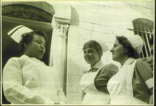 תלמידה ממלאווי באפריקה עם תלמידות מקומיות בפתח בניין מנזר סנט. ג'וזף ברחוב הנביאים, שם שכן ביה"ס לאחיות בין השנים 1961-1948 | אוסף 'הדסה' 30001110