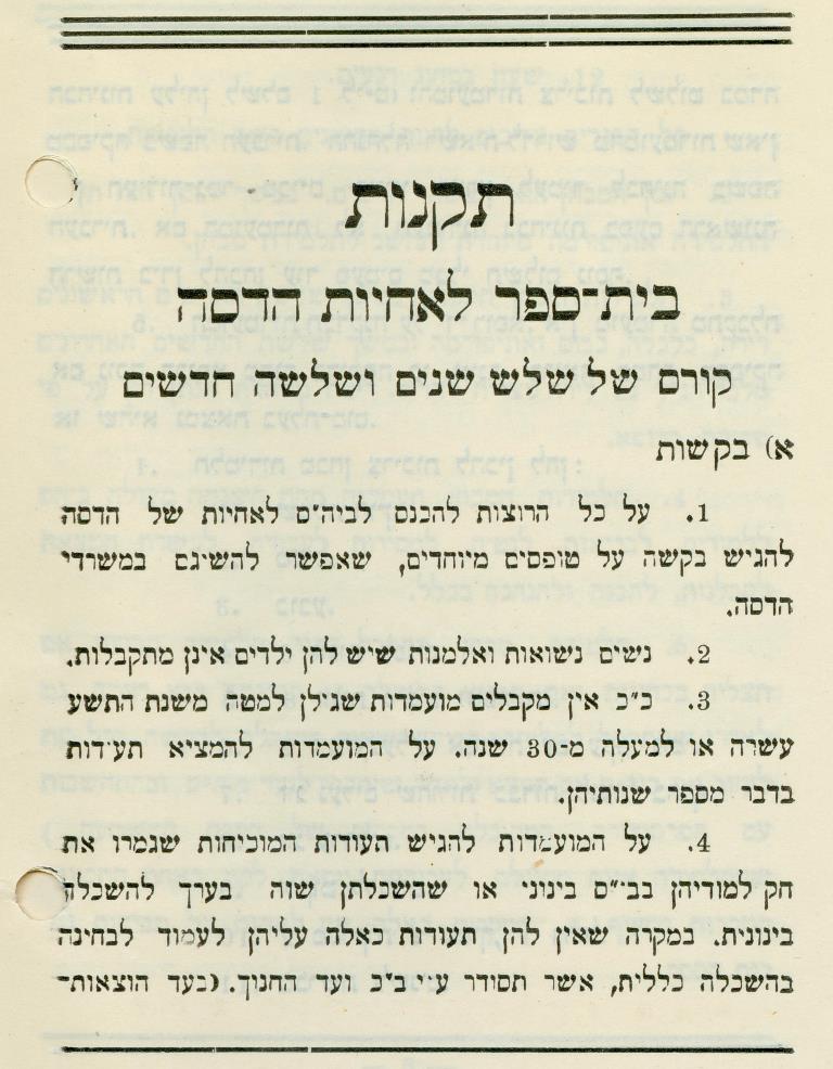 נשים נשואות ואלמנות עם ילדים אינן מתקבלות, תקנות בית הספר לאחיות 'הדסה', ירושלים תרפ"ה J117\504