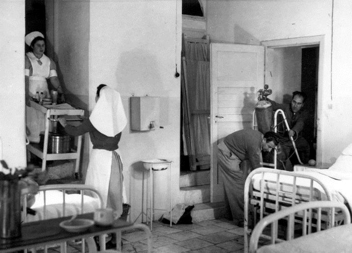 חדר אשפוז ב'בית הדגל', שבו שכנו מחלקות 'הדסה' לאחר הפינוי מהר הצופים. 1948 (משוער) | אוסף 'הדסה'