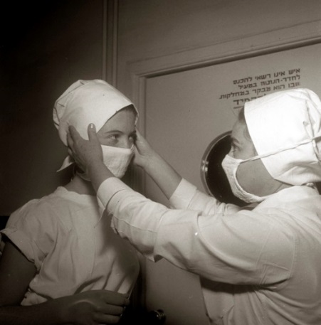 האחות הראשית של חדר הניתוח מכינה תלמידה לפני כניסתה לחדר ניתוח | אוסף 'הדסה'