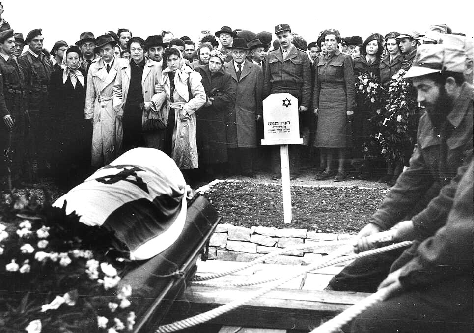 חנה סנש מובאת לקבורה בהר הרצל. ראש הממשלה דוד בן גוריון, ניצב לצד
