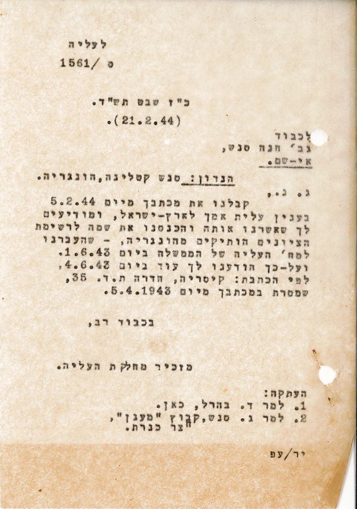 הארץ. מכתב התשובה מהמחלקה לעלייה נשלח אליה ב־21 בפברואר 1944, סמוך למועד יציאתה