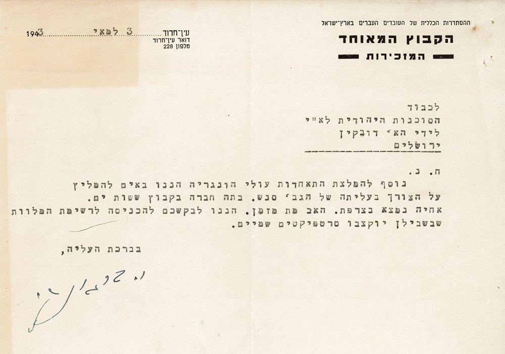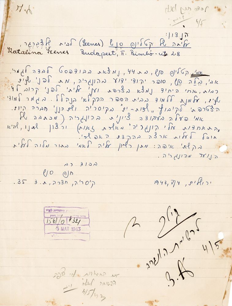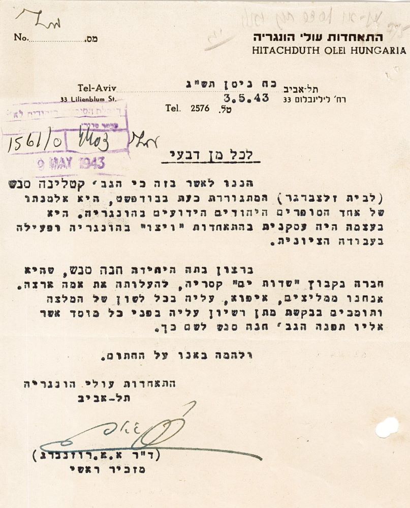 מהונגריה. היא ציינה שבינתיים התגייסה לצבא וכי אחיה הגיע לארץ מספרד. חנה ביקשה שמכתב