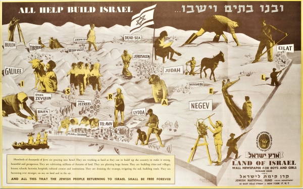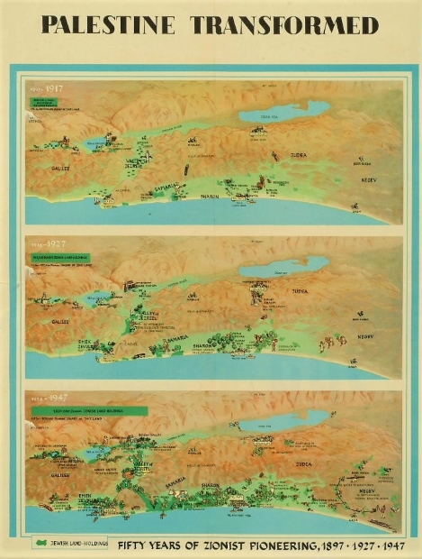 כרזה של קק"ל שמראה את התפתחות היישוב היהודי בארץ ישראל
