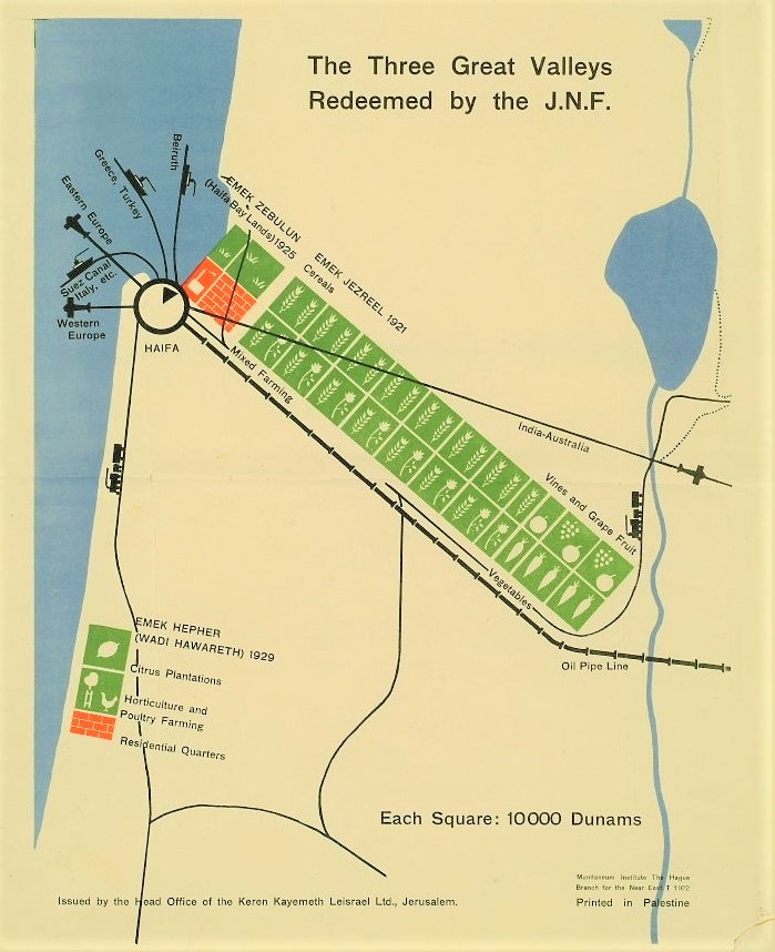 כרזה של קק"ל, המציגה את האדמות שנרכשו על ידה בשלושת העמקים הגדולים: עמק זבולון, עמק יזרעאל ועמק חפר, סוף שנות ה-20.