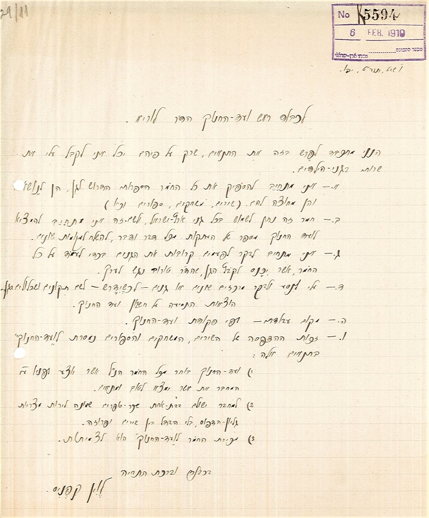 של המשרד הארצישראלי, בנוגע להעסקתו בכתיבת חומר ספרותי לגני ילדים, שבט תרע"ט,