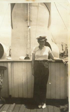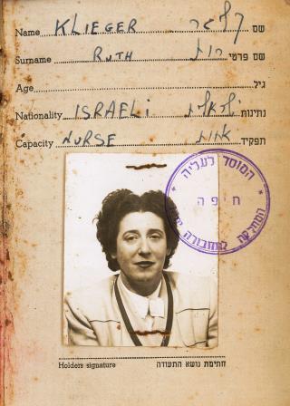 רות קליגר על סיפון אחת מאניות המוסד לעלייה ב' תעודת הספן על שם רות קליגר. הוגדרה כ"אחות"
