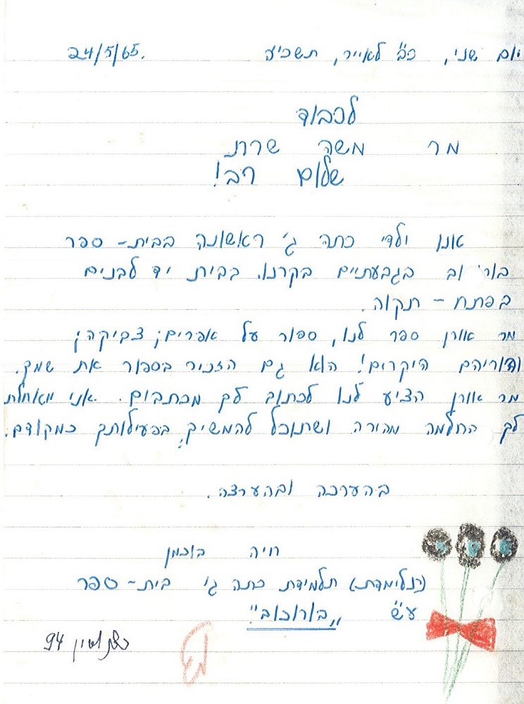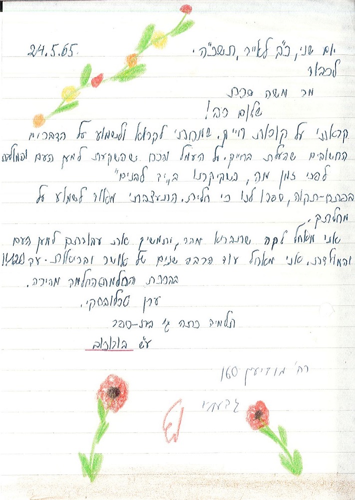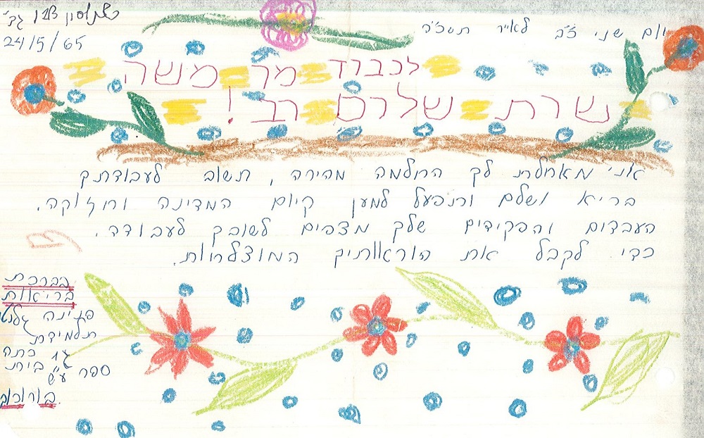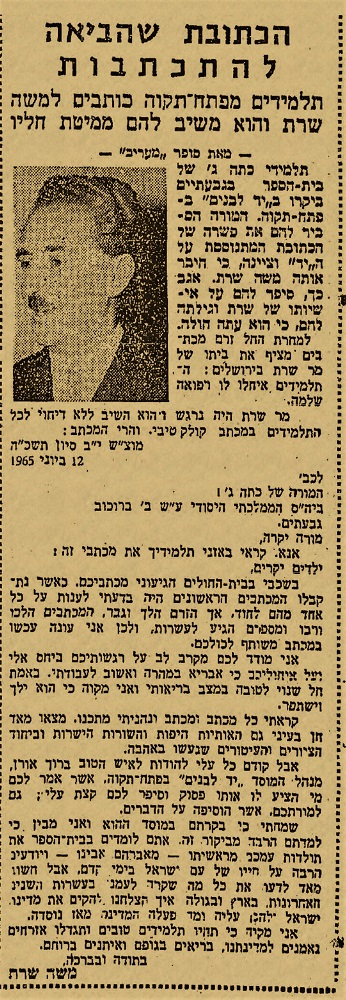 מאת משה שרת אל מחנכת כיתה ג'1 בגבעתיים, 12.61965 (S65\58)