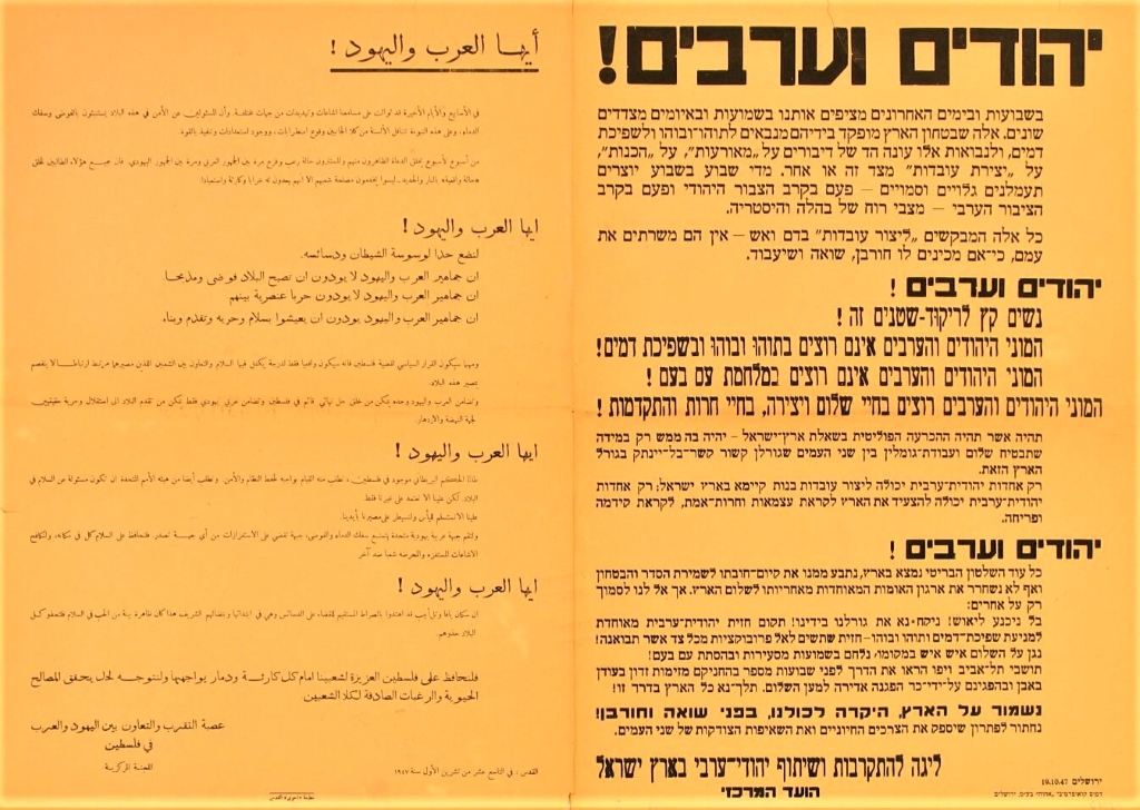 מודעה מטעם הליגה להתקרבות ושיתוף יהודי-ערבי בארץ