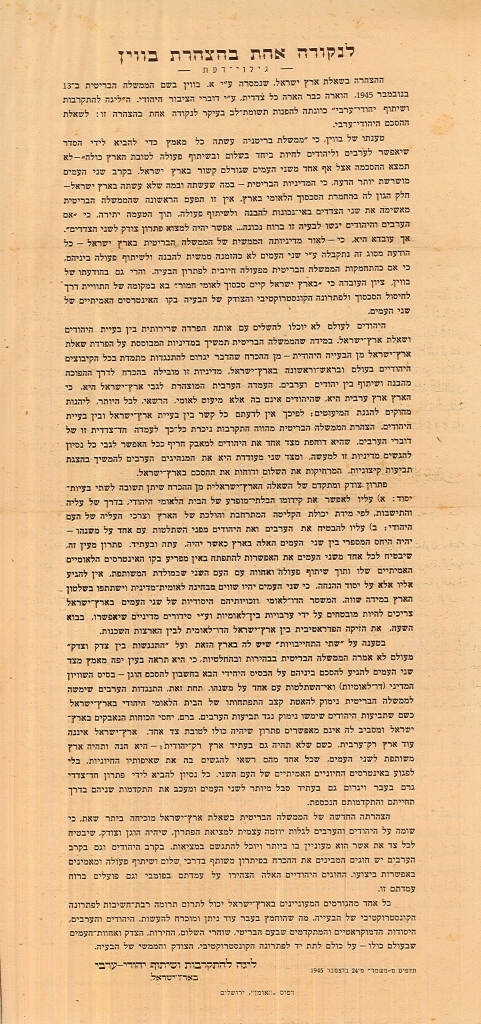 של הליגה להתקרבות ולשיתוף פעולה יהודי-ערבי בעקבות ההצהרה. ההצהרה, שפרסם ארנֶסט בֶּוִוין מראשי מפלגת הלייבור
