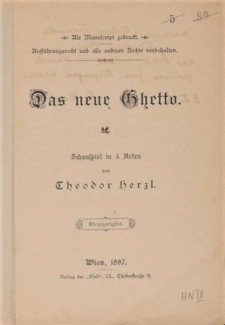 שער המחזה "הגטו החדש" בעברית, מאוסף שרות התצלומים (NPS\200163) ושער המחזה בגרמנית, מארכיון הרצל (H1\3528-3)