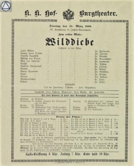 מודעה לפרסום ההצגה "גונבי ציד" מאת הרצל ב"בורגתיאטר",