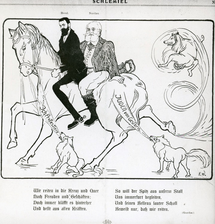 תצלומים של קריקטורות אנטישמיות נגד הרצל שפורסמו בעיתונות הגרמנית.