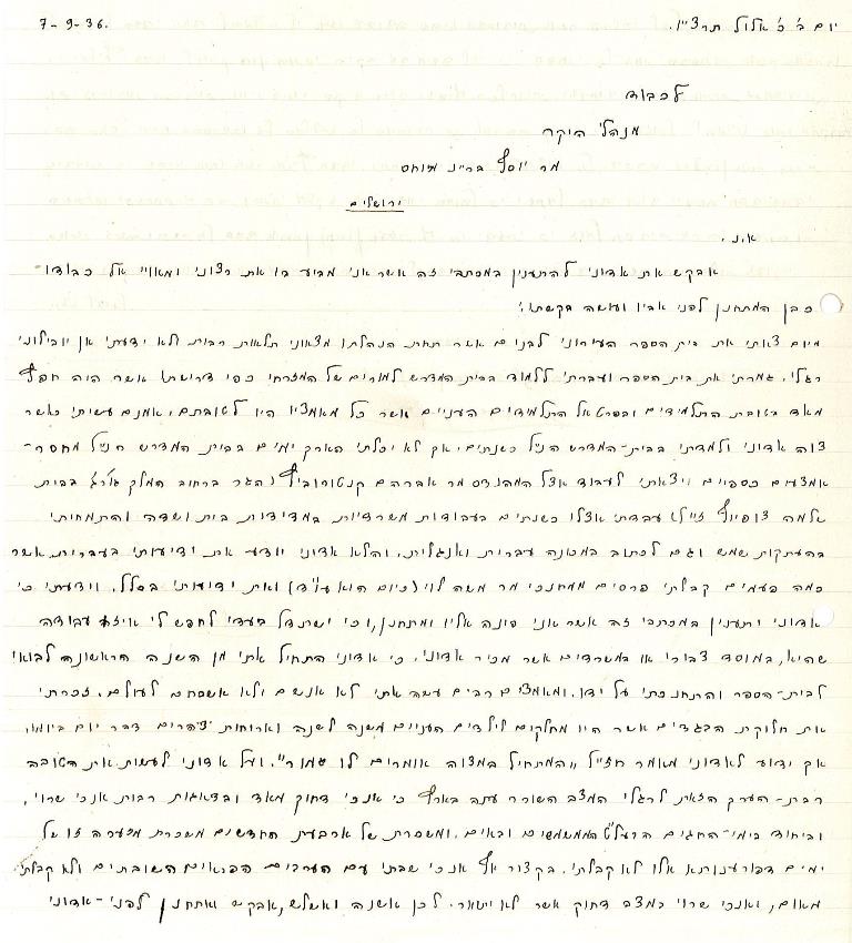 מכתב מיצחק ניסים משיח ובו הוא מבקש עזרה מיוסף מיוחס, 1936 (A58\63)