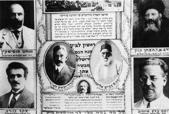 גלויה המתארת את ההודעה הרשמית על החלטת סן-רמו. בין ששת הנציגים היהודים גם יוסף מיוחס, 1920 (PHG\1030529)