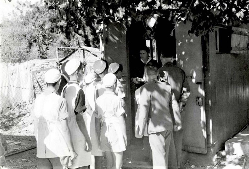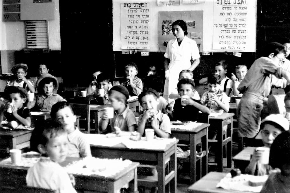 הבריאות", מחכים לקבלת מגש עם כוסות וקנקן חלב כדי לחלק לבני כיתתם. מתיקי ארכיון