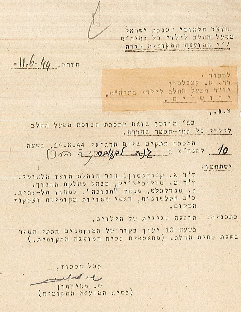 הזמנת ד"ר קצנלסון לחנוכת מפעל החלב