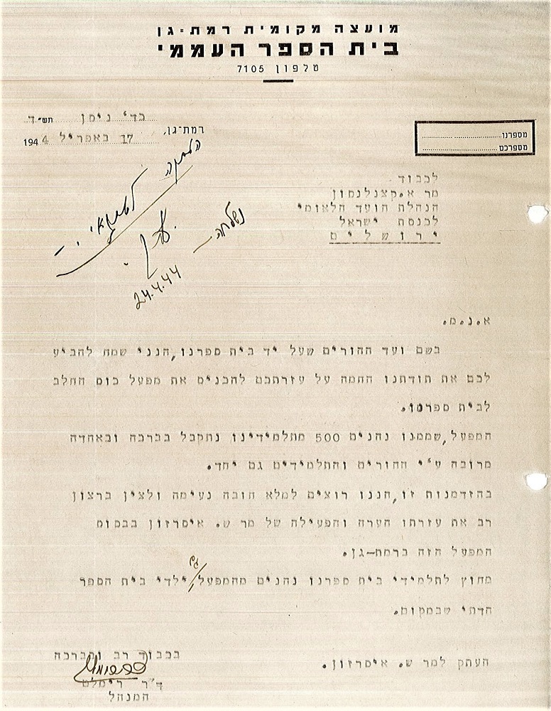 מכתב תודה מבית הספר היסודי ברמת גן על